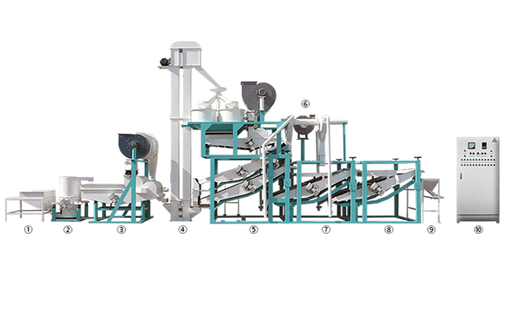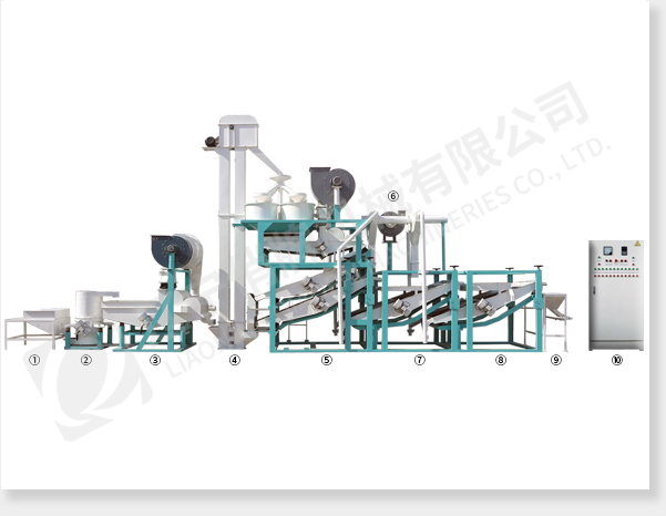 上料斗原料提升機 多功能除雜機 斗式提升機 脫殼、風選、分選主機 風力回料系統 籽仁復選機1 籽仁復選機2 接料斗 電氣控制柜